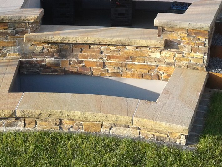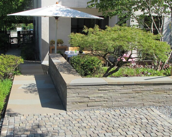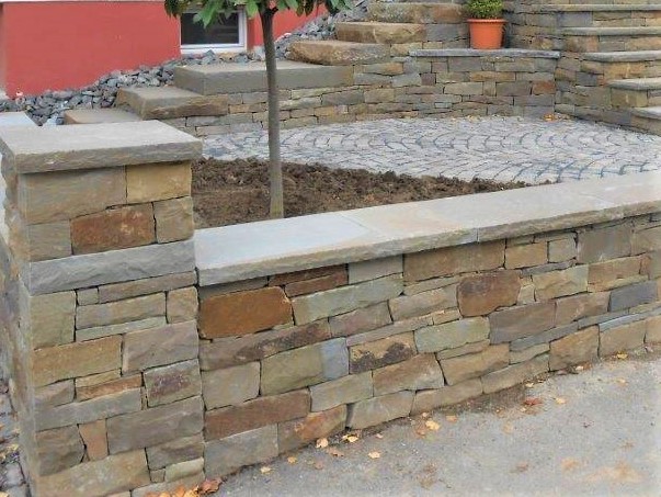 Als Mauerabdeckplatten setzt die Grauwacke Akzente und fügt sich harmonisch in die Gesamtgestaltung ein.