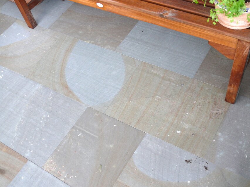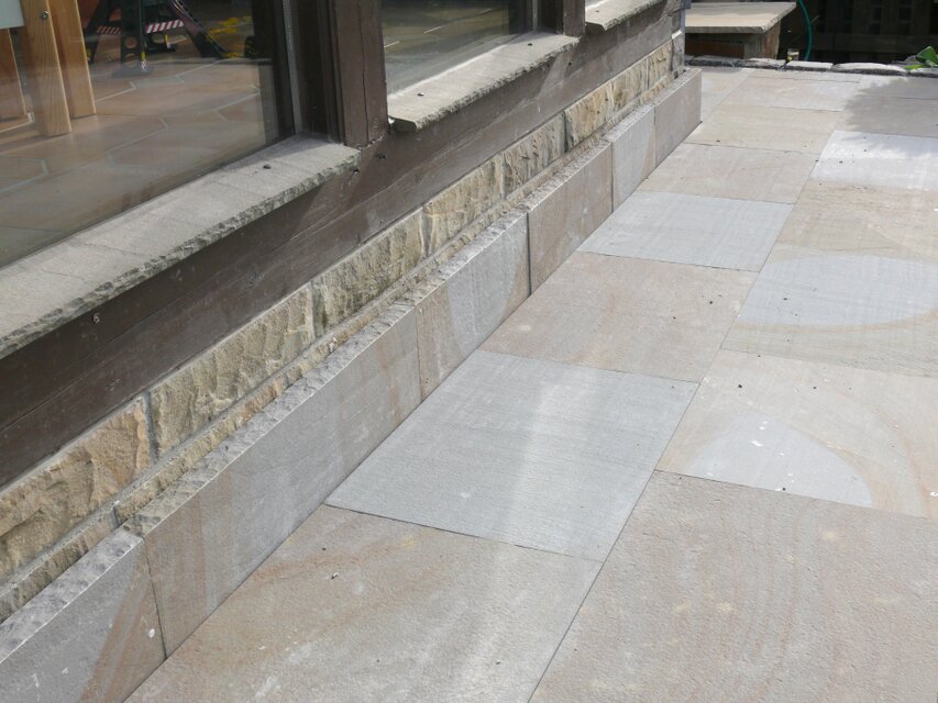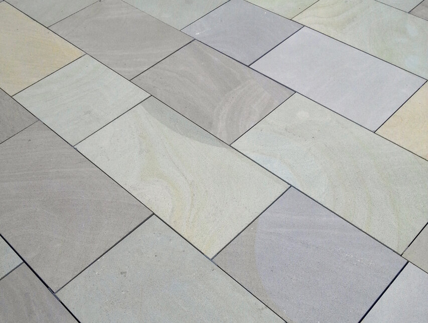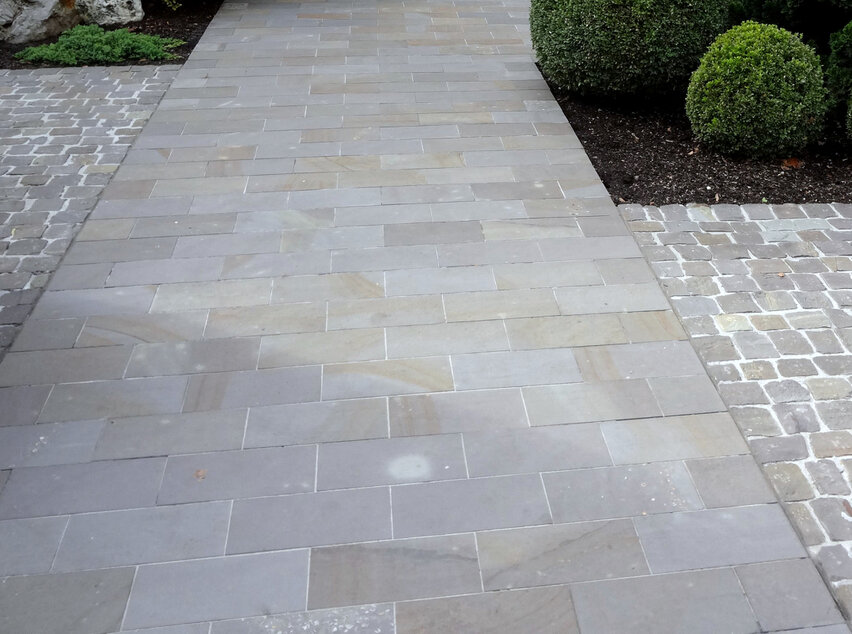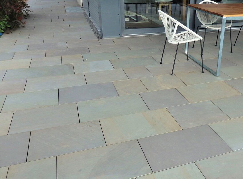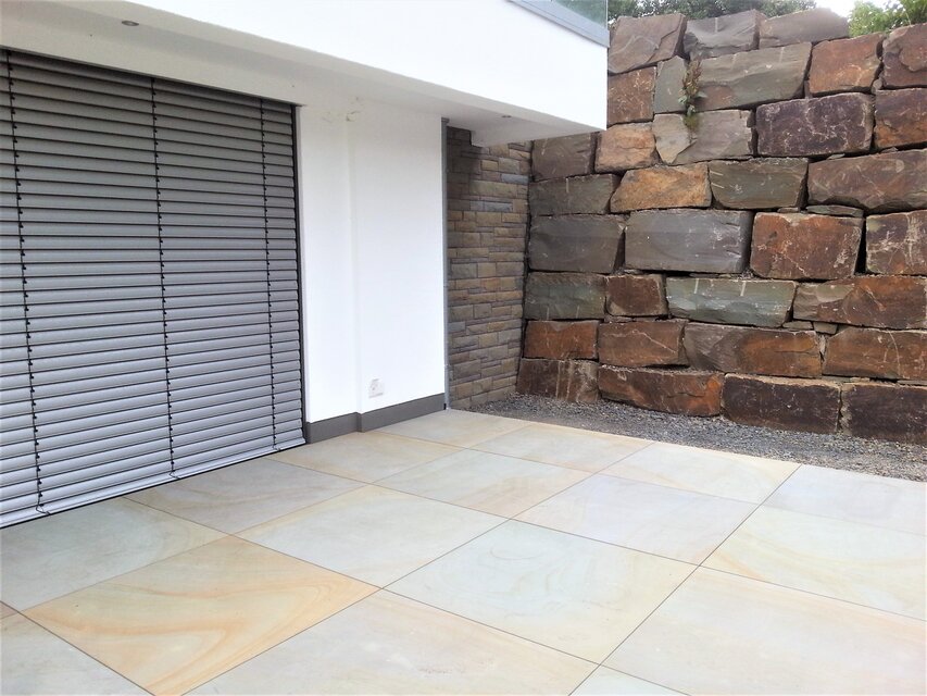 Mit der matt geschliffenen Oberfläche und den Erdfarbtönen fügt sich die Grauwacke dezent in das Wohnumfeld ein.