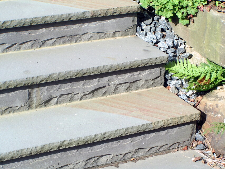 Neben massiven Blockstufen sind auch Beläge aus Naturwerksteinplatten für Treppen möglich.