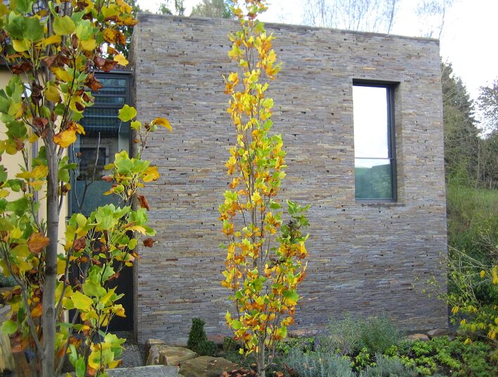 Als sehr natürlich erscheinende Verblendung fügt sich das Mauerwerk gut in eine naturnahe Gestaltung ein, kann aber durchaus auch bei moderner Architektur Akzente setzen.